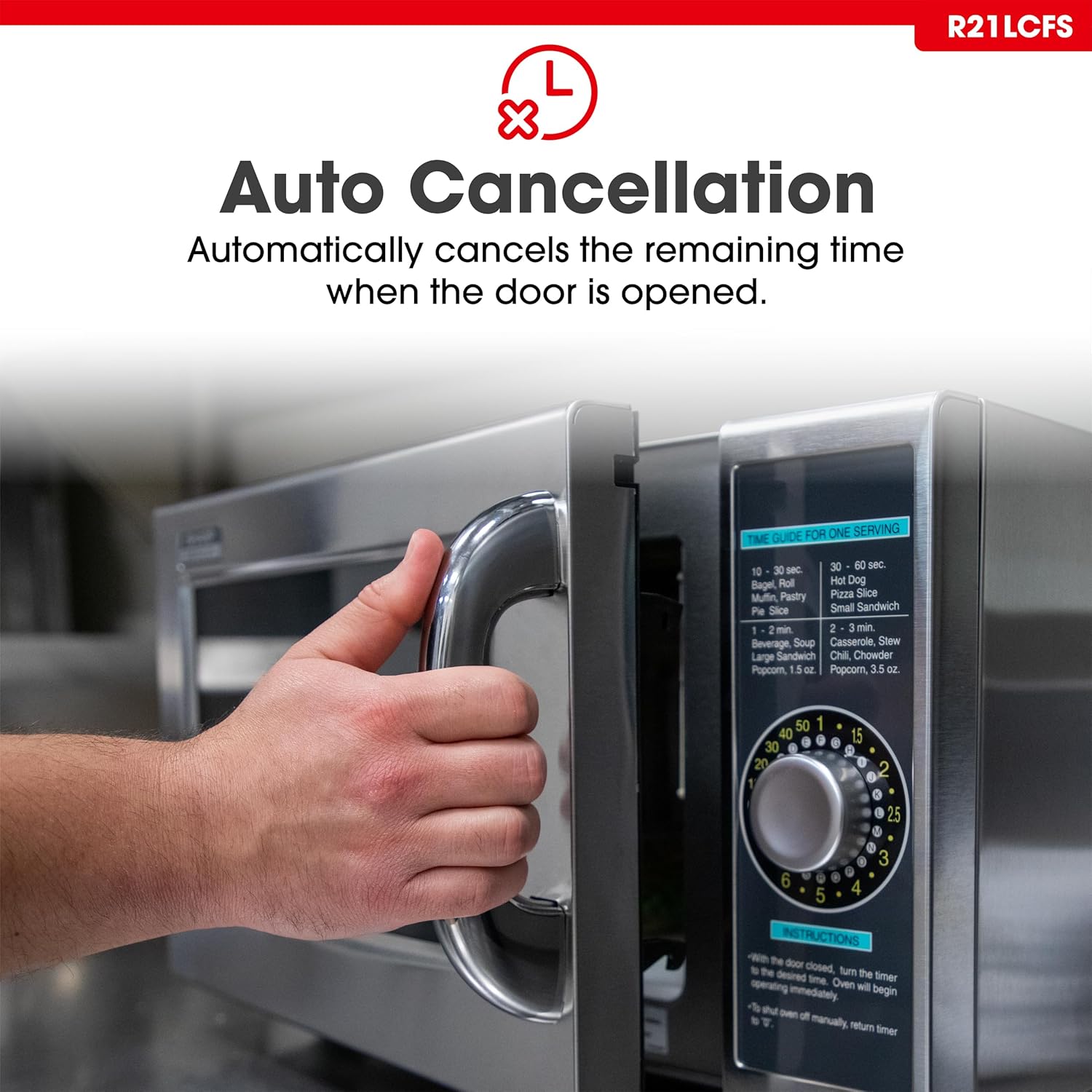 - AUTO-CANCEL TIMER: When the door is opened during cooking, the remaining time is cancelled; saving energy and increasing the magnetron's life.