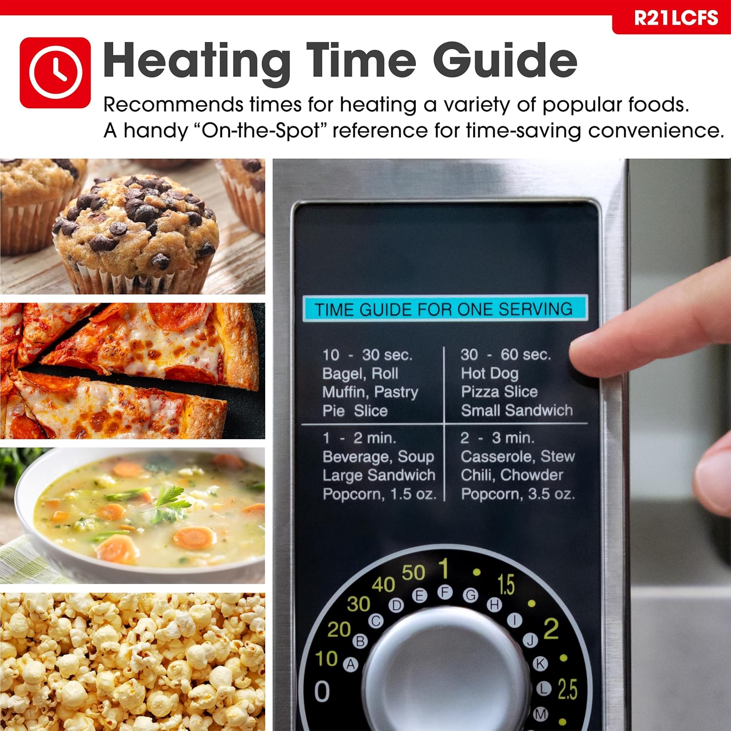 - HEATING TIME GUIDE: A handy "on-the-spot" reference for timesaving convenience is located above the timer with recommended times for heating a variety of popular foods.